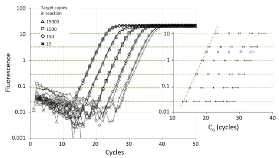 Because Cq cycles were needed for the fluorescence of the amplified product to reach the threshold, the logarithmic form of Equation (3) can be rearranged into an equation that shows the dependencies of Cq (Equation (4)).