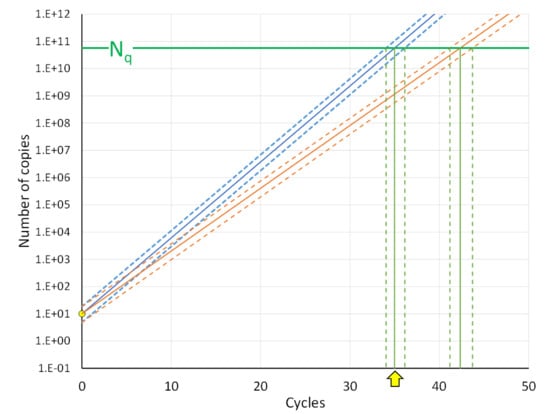 The graph illustrates the kinetic relation between Cq value and PCR efficiency for efficiency values between 1.9 (solid blue line) and 1.7 (solid orange line) with an input of 10 copies of target in the reaction (yellow dot). The difference in efficiency values results in a range of Cq values between 35 and 42 cycles (vertical, solid light green lines). Because of the Poisson sampling variation, an average input of 10 copies per reaction will actually range between 5 and 18 copies. With the same PCR efficiencies (dotted blue and orange lines) the range of Cq values is extended with another 2.5 cycles (dotted green lines). The quantification threshold (Nq) is set at the level where the 10 copies of the input, with a PCR efficiency of 1.9, result in a Cq value of 35 (yellow arrow) [15]. The graph is based on the kinetic equation of PCR (Equation (1)).
