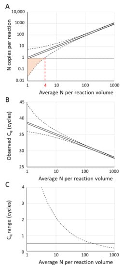 A graph of Equation (16) for different average number of copies in the reaction volume is drawn in Figure 6A (dotted lines). The converging lines on a logarithmic scale in the graph of Equation (16) show that the Poisson variation relatively decreases when the input in the reaction increases (Figure 6A). This leads to a similarly decreasing range of observed Cq values with higher input (Figure 6B). When the target number is below four copies per reaction volume, an increasing fraction of the reactions will receive less than one copy of the target and will, therefore, not show amplification; for these reactions, no Cq value can be determined (Figure 6A, pink area).