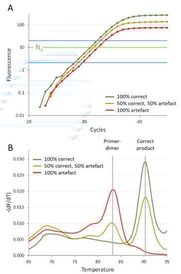 For valid qualitative and quantitative interpretation of qPCR results, the researcher should make sure that the observed amplification represents the amplification of only the correct specific product. In case of a DNA-binding dye assay, melting curve analysis is a quick and easy way to identify the presence of another than the intended target in the amplification reaction (Figure 7B) [43]. When a saturating dye is used, the contribution of the artefact to the observed fluorescence can be determined from the melting curves and used for correction of the observed Cq and N0 values [11].