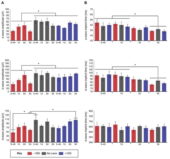 Bar graphs showing mean (±SE) ERG a-wave, b-wave and d-wave (A) amplitudes and (B) implicit times. Wave amplitude was defined as the distance from peak to trough, while implicit time was defined as the time between the flash onset and the wave peak (see Figure 1 for example). Statistically significant differences are indicated with an asterisk.
