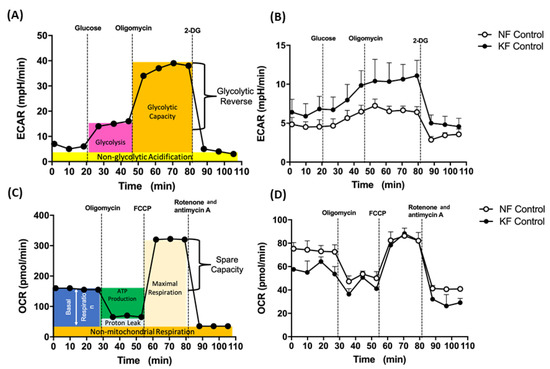 A Seahorse XF24 Extracellular Flux Analyzer (Agilent, Santa Clara, CA, USA) was used to continuously monitor the extracellular acidification rate (ECAR) and oxygen consumption rate (OCR) of fibroblasts. An XF Glycolysis Stress Test kit (103020, Agilent, Santa Clara, CA, USA) was used for glycolysis and an XF Mito Stress Test kit (103015-100, Agilent, Santa Clara, CA, USA) was used to test mitochondrial stress. Fibroblasts (1 × 104 cells /well) were seeded in an XF24 culture plate in DMEM supplemented with 2% FBS at 5% CO2 at 37 °C for 18–20 h. Before the experiment, fibroblasts were washed with PBS, replaced with 625 µL DMEM (pH = 7.4) without FBS and sodium bicarbonate, and then incubated in a CO2-free incubator at 37 °C. For the ECAR assay, 10 mM glucose, 1 µM oligomycin, and 75 mM 2-deoxy-glucose (2-DG) (a glucose analog) in XF Glycolysis Stress Test kit (103020, Agilent, Santa Clara, CA, USA) were injected to the medium (Figure 1A). First, glucose was injected to induce glycolysis. Subsequent treatment with oligomycin shut down OXPHOS with a compensatory glycolytic capacity. Next, by inhibiting glycolysis with 2-DG, glycolysis reserve was estimated by the glycolysis capacity divided by basal ECAR. For the OCR assay, 1 µM oligomycin (a complex V inhibitor), 1 µM carbonyl cyanide-phospho-(p)-trifluoro-methoxyphenyl-hydrazon (FCCP) (a proton gradient uncoupler), and 0.5 µM rotenone (a complex I inhibitor)/antimycin A (a complex III inhibitor) in an XF Mito Stress Test kit (103015-100, Agilent, Santa Clara, CA, USA) were subsequently injected to the medium (Figure 1C). First, baseline cellular OCR was measured, from which basal respiration was derived by subtracting non-mitochondrial respiration. Next, oligomycin was added, and the resulting OCR was used to derive ATP-production respiration (by subtracting the oligomycin rate from baseline cellular OCR) and proton-leak respiration (by subtracting non-mitochondrial respiration from the oligomycin rate). Further, FCCP was added to collapse the inner membrane gradient, driving the ETC to function to its maximal rate, and maximal respiratory capacity was derived by subtracting non-mitochondrial respiration from the FCCP OCR. Lastly, ETC function was shut down by addition of rotenone and antimycin A, which revealed the non-mitochondrial respiration. The mitochondrial spare capacity was calculated by subtracting basal respiration from maximal respiratory capacity.