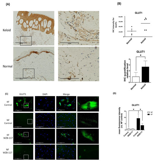 GLUT-1 expression was increased in both Fs and hyperfibrotic regions in keloid tissues. (A) Immunohistochemically staining for GLUT-1 in normal skin, and keloids (N = 5, normal skin; N = 5, keloids). Scale bar = 500 μm. Right panels are high-power views of tissues. Scale bar = 200 μm. (B) Scatterplots of expression levels; the middle line represents the mean value (* p < 0.05). (C) The immunofluorescence staining for GLUT-1 in NFs and KFs pretreated with or without 10 µM WZB117 for 48 h. Scale bar = 200 μm. The white rectangle in (C) indicates the GLUT-1 morphology for high magnifications at right panels. (D) is the quantification of IF from (C). Five random fields of each section were selected and more than 35 cells of each field were counted. Data are presented as mean ± SEM from 3 or more independent experiments (N = 6, * p < 0.05).