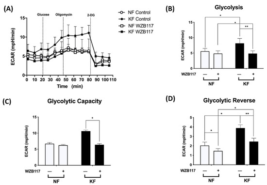 GLUT-1 mediated the enhanced glycolysis in KFs. NFs and KFs were pretreated with or without 10 µM of WZB117 for 48 h and then incubated with base medium at 37 °C in a non-CO2 incubator. Subsequently, 10 mM glucose, 1 µM oligomycin, and 75 mM 2-DG were injected to the medium. The ECARs were recorded and analyzed by the Seahorse XF-24 software, including (A) changes in the glycolytic function, (B) glycolysis, (C) glycolytic capacity, and (D) glycolytic reserve. Data are presented as mean ± SEM from 3 or more independent experiments. (N = 6, * p < 0.05, ** p < 0.01).