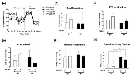GLUT-1 inhibition increased the mitochondrial OXPHOS in NFs. NFs and KFs were pretreated with or without 10 µM of WZB117 and then incubated at 37 °C in a non-CO2 incubator. Subsequently, 1 µM oligomycin, 1 µM FCCP, and 0.5 µM rotenone/antimycin A were injected to the medium. The OCRs were recorded and analyzed by the Seahorse XF-24 software, including (A) changes in the mitochondrial respiration, (B) basal respiration, (C) ATP production, (D) proton leak, (E) maximal respiration, and (F) spare respiratory capacity. Data are presented as mean ± SEM from 3 or more independent experiments. (N = 6, * p < 0.05, ** p < 0.01, *** p < 0.001).