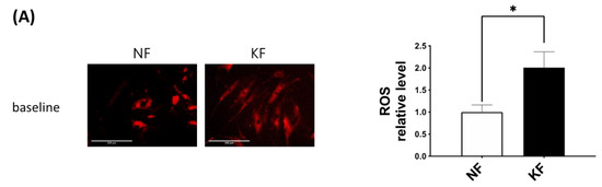 The MitoSOXTM Red mitochondrial superoxide indicator kit (36008, Thermo Fisher, Waltham, MA, USA) was applied to measure mitochondrial superoxide in fibroblasts. Fibroblasts (1 × 105 cells/well) were seeded overnight in a 12 well-plate then incubated with 1 mL 5 µM MitoSOX reagent solution for 10 min at 37 °C in a 5% CO2 incubator protected from light. After staining, the cells were replaced with fresh culture medium and observed under a microscope (Olympus, Tokyo, Japan) to determine the superoxide production from mitochondria.