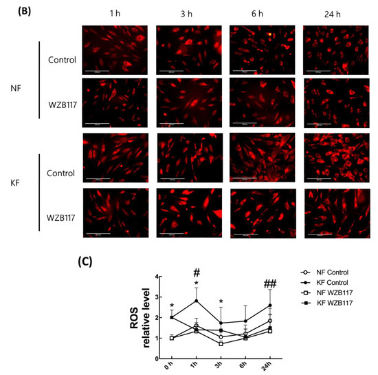 GLUT-1 regulated the enhanced ROS development in KFs. NFs and KFs were pretreated with or without 10 µM of WZB117 for 48 h. (A) The ROS at baseline. (B) The ROS in NFs and KFs after treatment with WZB117. Measures shown are the representative data from 3 independent experiments. Scale bar = 200 μm. (C) is the quantification of relative level from (B). Five random fields of each section were selected and more than 50 cells of each field were counted. Data are presented as mean ± SEM (N = 6, * p < 0.05, KFs control compared with NFs control; # p< 0.05, ## p < 0.01, KFs WZB117 compared with KFs control).