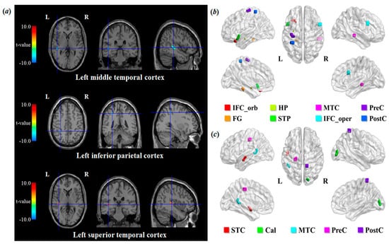 - Mazoyera, N.-; Landeau, B.; Papathanassiou, D.; Crivello, F.; Etard, O.; Delcroix, N.; Mazoyer, B.; Joliot, M. Automated anatomical labeling of activations in SPM using a macroscopic anatomical parcellation of the MNI MRI single-subject brain. NeuroImage 2002, 15, 273–289. [Google Scholar] [CrossRef]