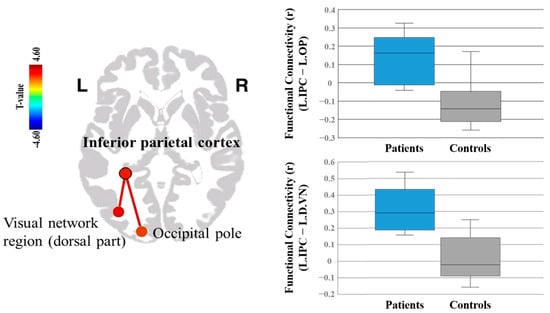 | Left inferior parietal cortex | Left occipital pole | 0.14 (0.13) | −0.11 (0.13) | <0.001 | 0.027 |
