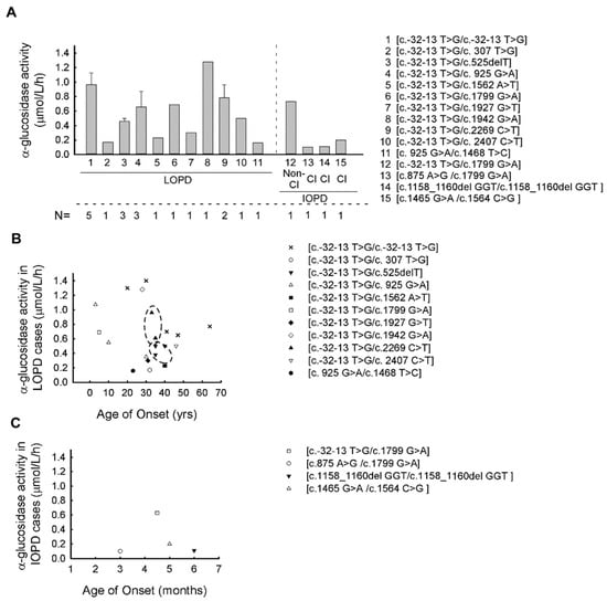 Association between GAA enzyme activity and patient’s genotypes in LOPD and IOPD: (A) The average α-glucosidase enzyme activity in different GAA genotypes in our cohort (the average for each genotype was calculated from the average values of the individual patient’s enzyme activity). (B) Correlation between the α-glucosidase enzyme activity and age of onset in different GAA genotypes in LOPD cases (genotypes showing high association with age of onset are indicated by a dashed line—the trends observed in these genotypes ([c.-32-13 T > G/c.525delT] and [c.-32-13 T > G/c.2269 C > T]) using the Pearson correlation did not show any significant differences). (C) Correlation between the α-glucosidase enzyme activity and age of onset in different GAA genotype in IOPD cases. (Abbreviations: LOPD—late-onset Pompe disease; IOPD—infantile-onset Pompe disease; Non-Cl—non-classical, Cl—classical, N—number of affected patients).