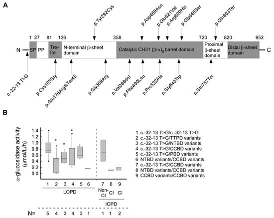 The localization of the found GAA mutations in protein structure and their effect on α-glucosidase enzyme activity: (A) Schematic representation of localization of the GAA mutations in protein structure. (B) The average α-glucosidase enzyme activity linked to different protein domain involvement in our LOPD/IOPD cohort (data analyses includes all 3 available enzyme activity values from all patients). (Abbreviations: SP—signal peptide; PP—propeptide, LOPD—late-onset Pompe disease; IOPD—infantile-onset Pompe disease; Cl—classical; non-Cl—non classical; TTP domain—trefoil type-P domain; NTB domain—N-terminal β-sheet domain; CCB domain—catalytic CH31 (α/β)8 barrel domain; PB domain—proximal β-sheet domain; N=—number of affected patients). (* p < 0.05). The lines represent the median values. To calculate significance, the groups LOPD 2, 3, 4 and 5 were compared to LOPD group 1 [c.-32-13 C > T/c.-32-13 C > T]. In the case of group LOPD 6, because the variant only affected a single patient, significance could not be calculated.