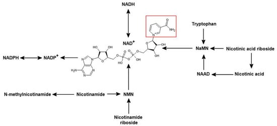 - Bogan, K.L.; Brenner, C. Nicotinic Acid, Nicotinamide, and Nicotinamide Riboside: A Molecular Evaluation of NAD+ Precursor Vitamins in Human Nutrition. Annu. Rev. Nutr. 2008, 28, 115–130. [Google Scholar] [CrossRef]