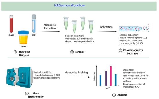 Braidy, N.; Villalva, M.D.; Grant, R. NADomics: Measuring NAD+ and Related Metabolites Using Liquid Chromatography Mass Spectrometry. Life 2021, 11, 512. https://doi.org/10.3390/life11060512