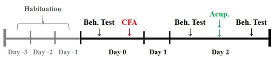 Timeline of the behavioral measurements. Before the tests, rats were allowed to acclimate for 3 days. CFA was administrated on day 0. AP was performed two days later. Pain thresholds were determined just before CFA injection (baseline) and before (modeling) and after treatment. Beh. Test: Behavioral test. Acup: Acupuncture treatment.