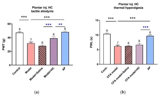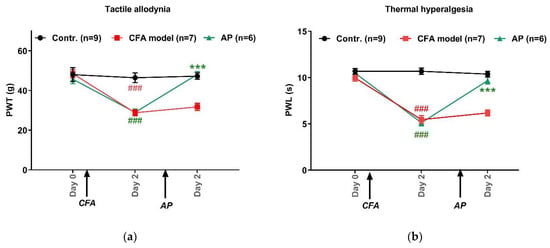 Effects of AP treatment on CFA-induced pain hypersensitivity (n = 6–9, mean ± SE). (a,b) Changes in tactile allodynia (PWT) and thermal hyperalgesia (PWL) of injured-side hindpaws, respectively. ### p < 0.001 vs. control. *** p < 0.001 vs. model.