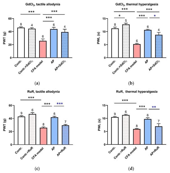 Involvement of MS channels at the acupoints in the AP analgesic mechanism (n = 4–9, mean ± SE). (a,b) Effects of pre-injection of GdCl3 (1 mM, 20 μL) in ST36 on AP-relieved PWT and PWL, respectively. (c,d) Effects of pre-injection of RuR (0.5 mM, 20 μL) in ST36 on AP-relieved PWT and PWL, respectively. Data illustrate the final behavioral tests. Numbers above each column denote sample size (n). * p < 0.05, ** p < 0.01, *** p < 0.001.