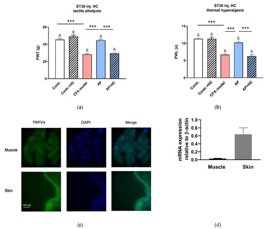 As for RuR, administration in ST36 with HC067047 (0.2 mM, 20 μL), a selective antagonist of TRPV4 channels, completely dampened the anti-nociceptive effect of AP on PWT (n = 6, p < 0.001 vs. AP) and PWL (n = 6, p < 0.001 vs. AP) (Figure 4a,b). Our immunofluorescence staining and RT-PCR assessment confirmed that TRPV4 was expressed in the acupoint tissues, especially in the skin layer (Figure 4c,d).