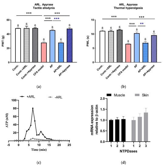 As reported, needling-induced Ado accumulation in the interstitial space contributed to triggering the AP analgesic mechanism [9,15]. We hypothesized that such Ado accumulation resulted from the hydrolysis of eATP. To verify this conjecture, subsequently, we intervened the eATP hydrolysis at the acupoints (Figure 6a,b). Neither ARL67156 (0.1 mM, 50 μL), a non-specific inhibitor of ecto-ATPases, nor apyrase (10 U, 50 μL), a highly active ATP-diphosphohydrolase, affected PWT or PWL at baseline. ARL67156 abolished AP-relieved PWT (n = 6, p < 0.001 vs. AP) and PWL (n = 6, p < 0.001 vs. AP). Apyrase did not further improve the anti-nociception induced by AP. Determination of the microdialysate revealed that in CFA-treated rats, eATP transiently accumulated during needling, which was remarkably facilitated in the presence of ARL67156 (0.1 mM) in the perfusion HBSS (Figure 6c). These results indicate that ecto-ATPases were active at the acupoints, which hydrolyzed eATP and indirectly accelerated Ado accumulation via combining with ecto-AMPases. The nucleoside triphosphate diphosphohydrolase (NTPDase) family represents the major ecto-ATPases, which degrade ATP to AMP with intermediate formation of ADP [24]. Our RT-RCR uncovered that NTPDase1-3 mRNA was expressed in ST36, including skin and muscle tissues (Figure 6d). These findings imply that eATP hydrolysis, following its accumulation, is a further necessary step towards initiating AP anti-nociception.