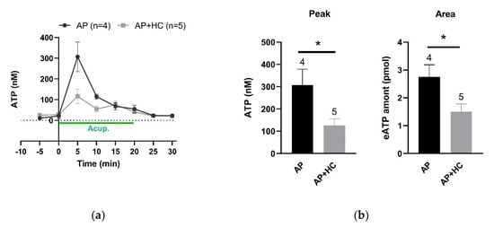 Effect of TRPV4 channel inhibition at the acupoints on needling-induced eATP accumulation (n = 4–5, mean ± SE). (a) Time-course of eATP changes during AP in the absence and presence of HC067047 (0.2 mM, 20 μL). Each sample contained 5 min microdialysate. (b) Comparison of eATP peaks and the total amounts, respectively, in the absence and presence of HC067047 (0.2 mM, 20 μL). Data based on (a). eATP amounts were calculated for the area under the curve from 0 to 20 min. * p < 0.05.