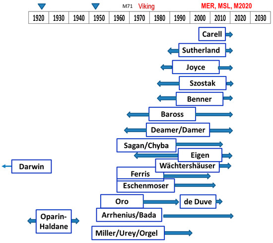 Some example groups that have spearheaded investigations into the origin of life, showing accelerated intensity in the study of prebiotic organic evolution pathways, subsequent to the findings of Miller–Urey experiment in 1953 [18] (Each block is one decade, e.g., 2010 = 2010 to 2019).
