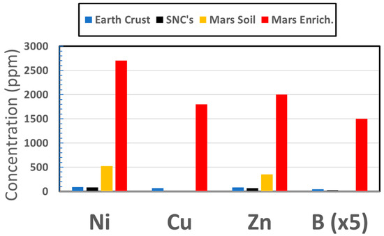 Although Mars has a 72% smaller cross-section for impact than Earth and a weaker gravity field, its cross-section for impacts scales the same as its surface area, such that the density of craters on land could be very similar. At the location of Mars farther out in the Solar System, it would be expected to experience a greater flux of C-bearing impactors by being nearer to the organically enriched bodies in the outer asteroid belt, as well as Kuiper belt objects and comets. Furthermore, from the relatively high Ni content of the Martian global soil (ranging from 400 to 600 ppm [123,124]) compared to the Ni in Martian basalts (165 ppm in Adirondack, 81 ppm in BounceRock, 79 ppm in Shergotty meteorite [125]), it can be inferred that the contribution of these exogeneous delivery sources to the shallower regolith of Mars resulted in relatively higher concentrations of organics than was for Earth, which had more extensive regolith turnover and obscuration due to higher rates of extrusive volcanism and sedimentary processing. The expanse of Earth’s global-scale ocean would have also lessened the relative importance of these endogenous contributions because its high dilution factor likely reduced their concentrations to be low, or negligible.