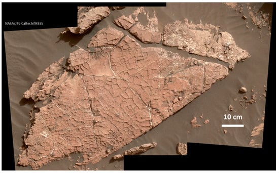 - Stein, N.; Grotzinger, J.P.; Schieber, J.; Mangold, N.; Hallet, B.; Newsom, H.; Stack, K.M.; Berger, J.A.; Thompson, L.; Siebach, K.L.; et al. Desiccation cracks provide evidence of lake drying on Mars, Sutton Island member, Murray formation, Gale Crater. Geology 2018, 46, 515–518. [Google Scholar] [CrossRef]
