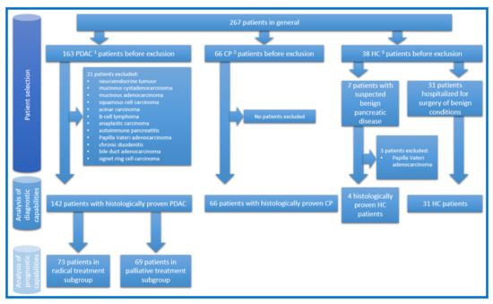 This research was approved by Vilnius Regional Ethics Committee for Biomedical Research on 10 September 2013 (approval number 158200-13-675-214). Informed consent was obtained from all subjects involved in the study. Between 20 November 2013 and 6 October 2020, 267 Caucasian patients were included in the study. They were treated in the Vilnius University Hospital Santaros Clinics. Patients were divided into three groups: patients with histologically proven PDAC, patients with histologically proven CP, and patients as HC (patients with histologically proven benign pancreatic disease (pancreatic mucinous or serous cystadenomas), or patients hospitalized for surgery of benign conditions (i.e., inguinal hernia, haemorrhoids). Surgical pancreatic tissue samples and blood serum samples were collected. Patients with PDAC were hospitalized either for radical treatment and underwent pancreaticoduodenectomy/hemipancreatectomy or for palliative treatment and underwent bypass operations and/or biopsies. Patients with CP underwent Frey’s procedure. HC patients underwent standard treatment for their benign conditions or pancreaticoduodenectomy/hemipancreatectomy in cases of benign pancreatic disease. In latter cases, samples are considered as HC as they were taken from adjacent healthy pancreatic tissue. The study design, numbers of patients in each analysed group, and reasons for exclusion are demonstrated in Figure 1. All tissue samples were collected during surgery and flash-frozen in liquid nitrogen for 10–15 min, then further stored at −80 °C until lysate preparation. All blood serum samples were collected directly before surgery and prepared for further storage at −80 °C according to a standardized protocol [21]. None of the patients in the PDAC group received neoadjuvant chemotherapy. Most of the patients with PDAC received adjuvant chemotherapy. All patients with PDAC had subsequent follow up between 0.5 and 5 years.