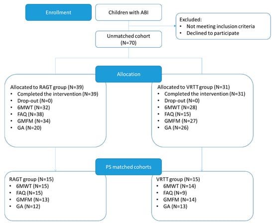 The unmatched cohort was composed of 70 patients allocated into two groups in a non-randomized way: 39 were allocated in the RAGT group and 31 were allocated in the VRTT group. The IQ evaluation was available for 57 patients (28 in the RAGT group, 29 in the VRTT group). Due to equipment availability, or the inability of patients to perform a test, 6MWT was performed in 32 patients in the RAGT group and 28 patients in the VRTT group, FAQ was present for 38 patients in the RAGT group and 15 patients in the VRTT group, GMFM was performed in 34 patients in the RAGT group and 27 patients in the VRTT group, and GA was available for 20 patients in the RAGT group and 26 patients in the VRTT group. There were no dropouts in the study (Figure 2).