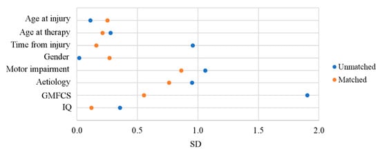 A PSM algorithm was used to identify matched cohorts as a subgroup of the unmatched cohorts, and was defined as follows. First, covariates were selected among the baseline measurements under the hypothesis that they contribute to the choice of the treatment. Age, gender, time elapsed from injury, GMFCS and motor impairment were selected as covariates. Then, a logistic regression was performed to estimate the propensity scores, considering the intervention as outcome variable and selected covariates as predictors. The matching between RAGT group and VRTT group was obtained by using the 1:1 nearest-neighbor procedure that means that each individual of the VRTT group was matched with one of the RAGT group in terms of propensity score, discarding individuals with propensity scores outside the range of the other group. Finally, to check the model adequacy, the standardized differences between the groups were computed before and after matching for continuous, dichotomous, and categorical variables, according to [25]. The PSM algorithm was developed in Rstudio by means of the MatchIt library. The matchit() function was used with the method “nearest” to implement the 1:1 nearest-neighbor matching.