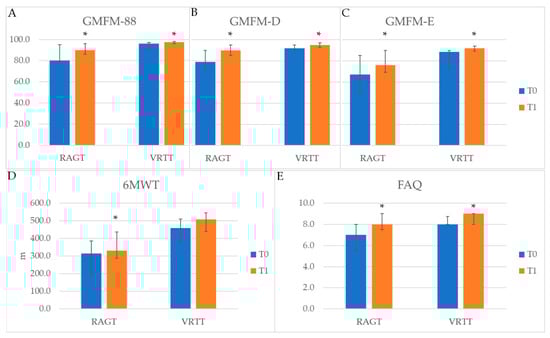 Functional measures of the matched cohorts. * Wilcoxon signed rank test with p < 0.05. (A) GMFM: Gross Motor Function Measure; (B) GMFM-D and (C) GMFM-E; (D) 6MWT: 6 min walking test; (E) FAQ: Gillette Functional Assessment Questionnaire; RAGT: Robot-Assisted Gait Training; VRTT: Virtual Reality Treadmill Training.