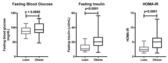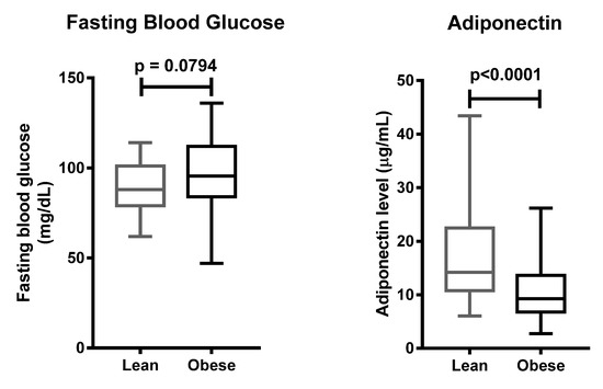 Clinical parameters of lean and obese subjects. Data are presented with boxplots, in which the boundary of the box closest to zero indicates the 25th percentile, the line within the box marks the mean, and the boundary of the box farthest from zero indicates the 75th percentile. Whiskers above and below the box indicate the minimum and maximum values. Statistical significance was analyzed by Mann–Whitney test.