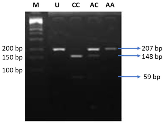 Electrophoresis of the digested products by AvaII. M: DNA marker 100 bp; U: uncut PCR product (207 bp); CC: risk alleles (148 and 59 bp); AC: heterozygous (207, 148, and 59 bp); AA: non-risk alleles (207 bp).