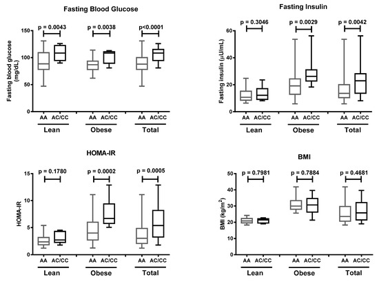 Obese individuals with the AA genotype were 5.5 (CI 2.0–14.3) times more likely to suffer insulin resistance (Table 4). Our study showed that subjects with obesity carrying the AC/CC genotypes possessed the highest risk of insulin resistance (OR = 6.6, 95% CI 1.3–34.5). These results were supported by higher values of fasting blood glucose in subjects carrying the AC/CC genotypes, regardless of their obesity status. Fasting insulin and HOMA-IR were significantly higher in obese but not in lean AC/CC genotype carriers. Meanwhile, BMI was not different between subjects carrying the AC/CC or AA genotypes (Figure 3). These data suggested that the K121Q SNP of the ENPP1 gene increases the risk of insulin resistance in obese individuals.