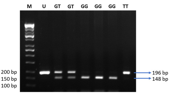 Electrophoresis of the digested products by MvaI. M: DNA marker 100 bp; U: uncut PCR product (196 bp); GG: risk alleles (148 and 48 bp); GT: heterozygous (196, 148, and 48 bp); TT: non-risk alleles (196 bp).