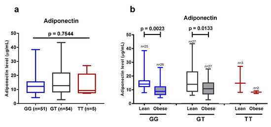 (a) Plasma adiponectin level in 110 subjects that carry different genotypes at the +276G > T SNP of ADIPOQ gene. (b) Adiponectin level in the lean and obese group with regard to the presence of different variants at the +276G > T SNP of ADIPOQ gene. Data are presented as in Figure 1, Figure 3, and Figure 5. Statistical significance was analyzed by one-way ANOVA (a) or unpaired Student’s t-test (b).