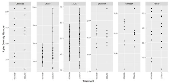 Alpha diversity metrics are shown in Figure 1. Between 32–51 bacterial species were observed in the microbiome. Observed richness showed no statistically significant difference (p = 0.499). Chao1 and ACE showed two samples of the SP100 group with a notably higher diversity in the FM100 group, but also one sample within this group had the lowest diversity in regard to the FM100 group. Similar findings were represented by the Shannon and the Simpson indices with the lowest diversity in a sample in FM100 and the highest in a sample from SP100. However, Fisher’s alpha parameter seemed to be only slightly different.