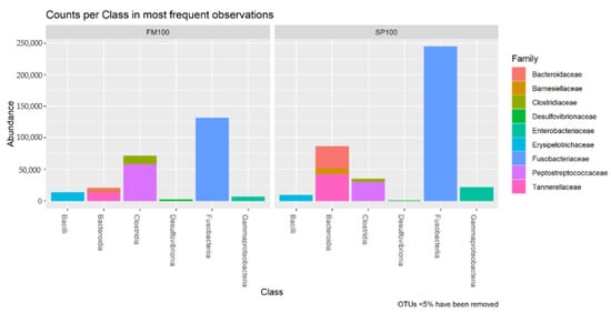 Bacterial counts per class of the most frequent observations (OTUs < 5% were removed) of FM100 (n = 8) and SP100 (n = 9).