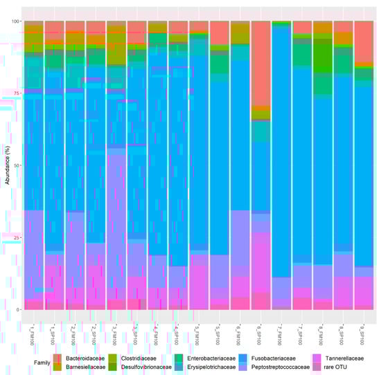 Relative abundances for each sample on family level are shown in Figure 3. OTUs (operational taxonomic units) with < 5% were declared as “rare OTUs” (represented in Figure 4). Similar to Figure 2, high percentages of Fusobacteriia represented the most abundant bacteria in most of the probes. There were, however, two exceptions to this with 3_FM100 indicating a high proportion of Peptostreptococcaceae and 6_SP100 with a high abundancy of Bacteroidaceae. As such, overall, we could observe a high variation between samples.