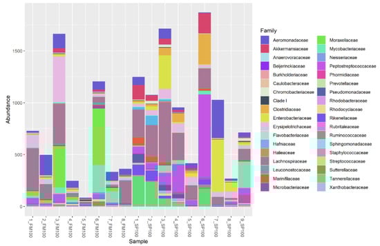 Relative abundance (%) at family level for samples in FM100 (n = 8) and SP100 (n = 9).