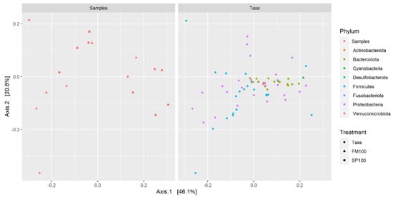 Analysis was carried out with R (version 3.6.3) []. Microbiome data were normalized per sample and processed with R package “phyloseq”, and a PcoA plot was computed on phylum level []. Alpha diversity was calculated for common metrics (Chao1, ACE, Shannon, Simpson, and Fischer) and a Wilcoxon rank test was performed to compare the observed diversity in FM100 and SP100. Bar plots were produced with “ggplot2” [].