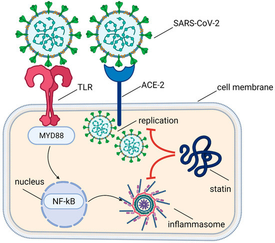 In patients with confirmed COVID-19 infection, the optimal treatment of cardiovascular diseases, prevention of their decompensation, and prevention of heart and vessel damage is as important as antiviral therapy. Unfortunately, there is no convincing evidence for the efficacy of any medication in SARS-CoV-2 treatment. The reports so far indicate the possibility of implementing treatment with convalescent plasma, tocilizumab, remdesivir, lopinavir/ritonavir or favipiravir [9,10,11,12]. Due to the current lack of reliable confirmation of the efficacy of proposed therapies and their potential side effects, it is recommended to use them only in hospital settings as part of clinical trials [13]. In the absence of a specific treatment, it is crucial to establish the effect of co-administered medications in patients with COVID-19. Among cardiovascular medications, statins play a crucial role both in primary and secondary prevention of cardiovascular events [14]. Moreover, statins have well-established pleiotropic effects, including improvement of endothelial dysfunction, antioxidant properties, atherosclerotic plaque stabilization, and inhibition of inflammatory responses [14]. All these effects might be especially beneficial in patients with COVID-19 suffering from endothelial dysfunction, microvascular, and macrovascular thrombosis, and cytokine storms [15,16]. Here, we review the pathophysiology of SARS-CoV-2 activity in host cells, proposed COVID-19 therapy, the pleiotropic activity of statins, and statins in clinical trials in respiratory infections.