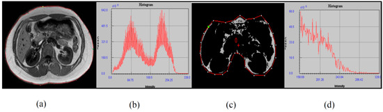 The image was analyzed using Medical Image Processing, Analysis, and Visualization-software package. (a) T1 weighted DICOM MRI image at the L3₋L4 level, (b) total abdominal tissue-related histogram, (c) segmented image for visceral adipose tissue, and (d) related histogram.
