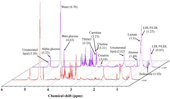 Serum metabolites of NW and OW/OB groups were detected by 1H NMR method. Fresh serum samples were removed from −80 °C storage and thawed at room temperature. An optimized method was adopted for preparing the samples after centrifuging at 16,000× g for 10 min at 4 °C. Then, 100 μL of supernatant was dissolved by adding 500 μL of dimethyl sulfoxide-D6 with 99.8% deuteration mixed gently. The 550 μL of homogeneous solution was pipetted into 5 mm capillary tubes for NMR measurement. The proton spectrum was acquired at 27 °C on a Bruker AVANCE 500 MHz (Bruker, Bremen, Germany) with Carr-Purcell-Meiboom-Gill (CPMG, –RD–90°–(t–180°–t) n–acquire) using water-suppression pre-saturation pulse sequence. A 90° pulse with a 16 number of signal averaging (NSA) was applied. The baseline and phase correction were carefully adjusted by TopSpin 4.0.7 software. Spectra in the 0 to 8 ppm range were analyzed. The spectral data were normalized to the total integrated area prior to the data analysis. The metabolite resonances were assigned based on comparison with existing literature and human databases [27].