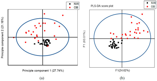 1H NMR variables of 30 NW in black and 26 OW/OB in red, are plotted according to different BMIs based on the 24 sera, (a) PCA score plot and, (b) PLS-DA score plot.
