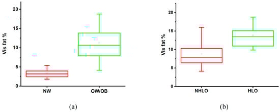 Box plot of mean visceral fat percentage, (a) normal-weight (NW) and overweight/obese (OW/OB), (b) non-hyperlipidemia obesity (NHLO) and hyperlipidemia obesity (HLO).