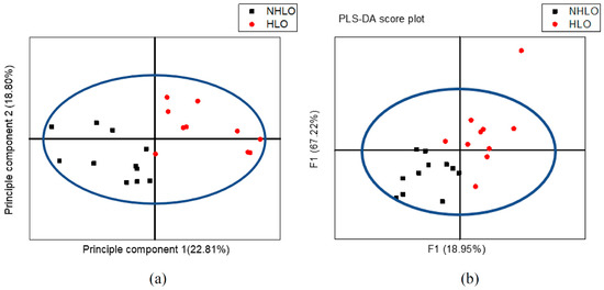 1H NMR variables of 13 non-hyperlipidemia (NHLO) obese in black color and 13 hyperlipidemia obese (HLO) in red color are plotted according to lipid profile parameters based on the 24 sera, (a) PCA score plot, and (b) PLS-DA score plot.