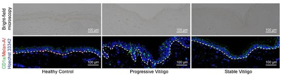 Langerhans cells (LCs) are skin-resident antigen-presenting cells that are characterized by CD1a and CD207/langerin expression, as dendritically shaped cells located in the epidermis. LCs play an important role in local defense and the establishment of immune responses [8,9]. Within the epidermis, LCs are positioned in the suprabasal layer and communicate with keratinocytes and melanocytes [10]. Epidermal LCs have been proposed to contribute to vitiligo, although their exact role remains unclear. In particular, a number of studies have reported contradictory results regarding the quantity of epidermal LCs in vitiligo, and there are no published data describing their features in vitiliginous skin [11,12,13].