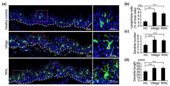 Increased number of LCs, dendrites per LC, and dendrite length in lesional skin from progressive vitiligo and progressive rhododendrol-induced leukoderma (RDIL). (a) Skin sections from healthy controls (n = 5), non-segmental vitiligo in the progressive state (Progressive Vitiligo, n = 8), and RDIL in the progressive state (RDIL, n = 13) were stained with anti-CD1a antibodies (green). Nuclei were stained in blue with Hoechst 33342. Representative images are shown, with higher-magnification images corresponding to the area surrounded by the red rectangles in left panels shown at right. Scale bar: 50 μm. Quantification of LCs (percentage of total cells in epidermis) (b), number of dendrites per LC (c), and length of dendrites (d) in LCs. Data in (b–d) are shown as the means ± standard deviation (SD). *** p < 0.01.