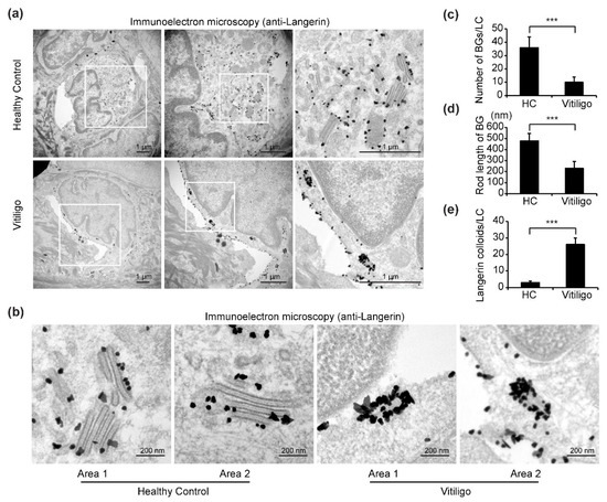 We next investigated the ultrastructural features of the LCs in samples from progressive vitiligo using immuno-transmission electron microscopy (TEM). In total, three samples from progressive vitiligo and three samples from healthy controls were stained with anti-langerin (CD207) antibodies and subjected to immuno-electron microscopy analyses. We chose to stain for langerin as this is another specific marker for LCs and a crucial component of BGs, a unique rod-shaped organelle found in LCs [27].
