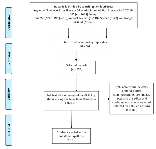 Four databases were searched, PubMed/MEDLINE, Web of Science, Scopus, and Google Scholar, using the following as keywords: “low-level laser therapy OR photobiomodulation therapy AND COVID-19”. The collection of articles was carried out considering the period of publication from January 2020 to 31 January 2021, by two evaluators previously used to the evaluation of the criteria to avoid bias in the selection.